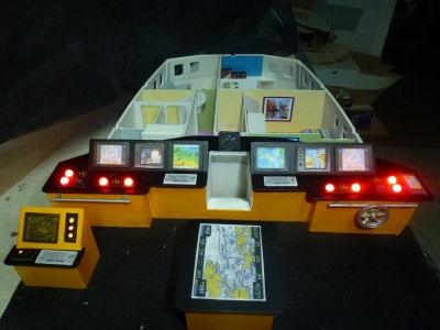 le pupitre de la timonerie . Les cadrans et cartes sont des image téléchargées et réduites à l’échelle